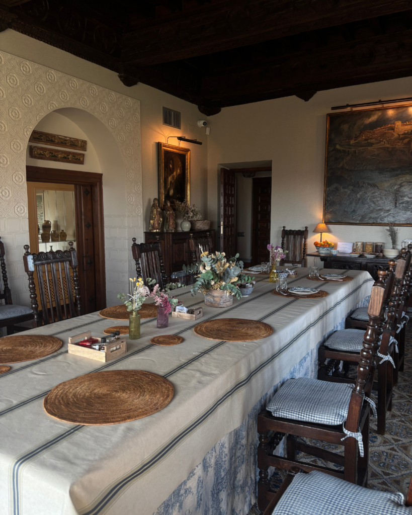 A partir del mes de mayo abren la piscina al público, un lugar donde refugiarse del calor toledano. Te recomiendo ir en otoño o en primavera porque el paisaje pinta tal y como lo ves en las imágenes y parece que hubieras entrado en una escena de la famosa serie «Los Bridgerton». Una de mis cosas favoritas fue el desayuno (te muestro una foto más abajo), pero era en el comedor que ves arriba. Un salón espectacular ambientado con una suave música clásica, cuadros de época, flores y vistas a la ciudad.