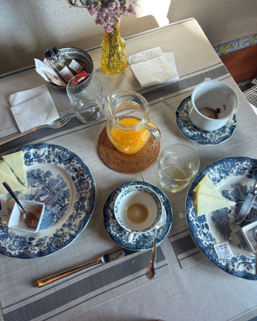 Llegados a este punto, he de admitir, que no tengo una imágen del desayuno antes de disfutarlo, pero puedo contarte lo que había antes en el plano que ves arriba, te pediré solo que te lo imagines, no será difícil. Y que antes había unos molletes de pan poco hecho y tostado con aceite (de jaén), tomate batido, jamón y lomo (nosotos no tomamos esto porque comemos vegetariano), nos lo cambiaron por queso y huevo revuelto. También nos pusieron café y zumo de naranja natural recién exprimido. ¿Hay un desayuno mejor? Yo creo que no, sin duda este es mi favorito siempre.